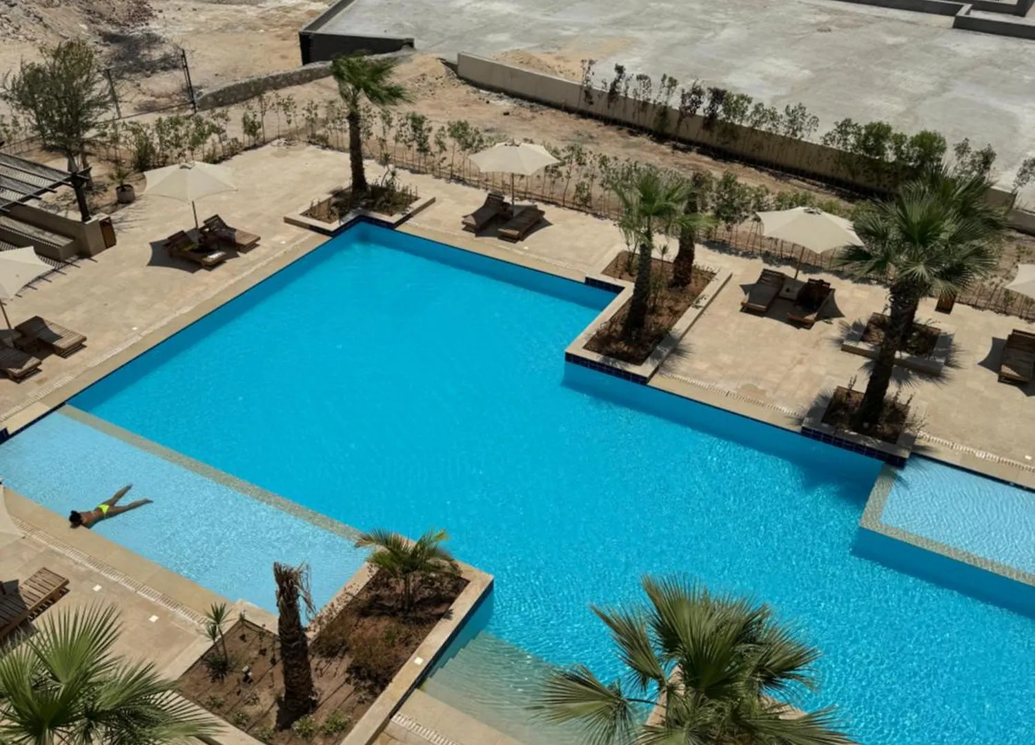 The apartment features views of the pool.
